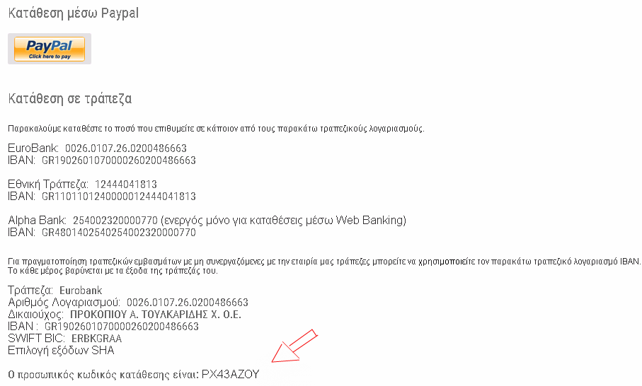 Για την πληρωμή σας θα πρέπει να χρησιμοποιήσετε τον προσωπικό σας κωδικό κατάθεσης.