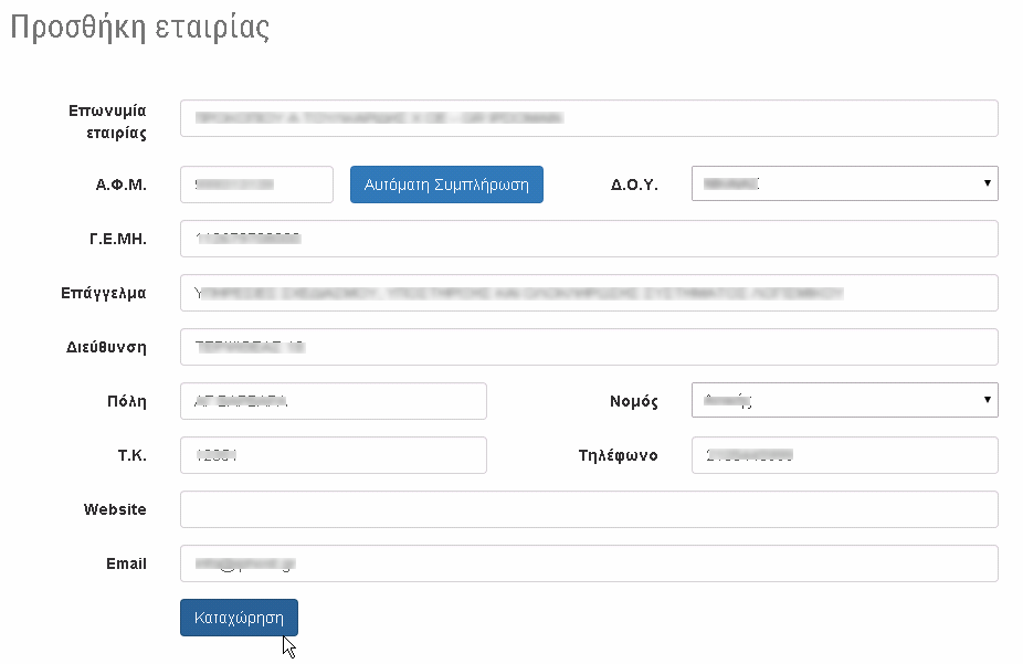 Συμπληρώστε το ΑΦΜ της εταιρείας στο αντίστοιχο πεδίο και πατήστε Αυτόματη Συμπλήρωση.