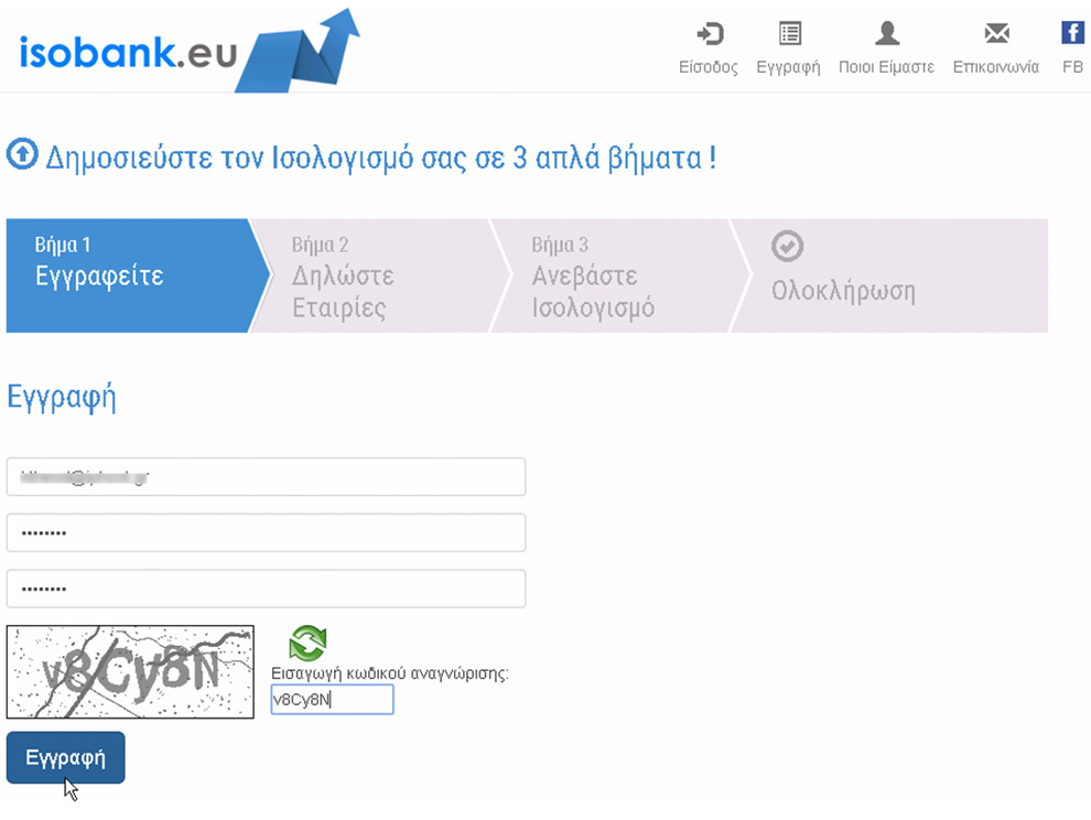 Στη φόρμα συμπληρώνετε στα πεδία το email και password με τα οποία θα εγγραφείτε στο isobank.eu.